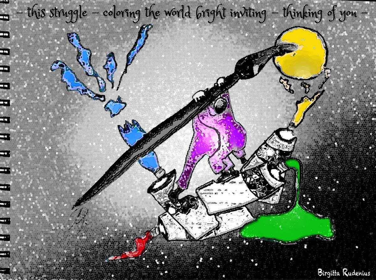 Thinking of you October 16, 2018 by B i r g i t t a, posted in drawings, HAIKU, Love challenge, Poetry, sketch – this struggle – coloring the world bright inviting – thinking of you – Like Loading...