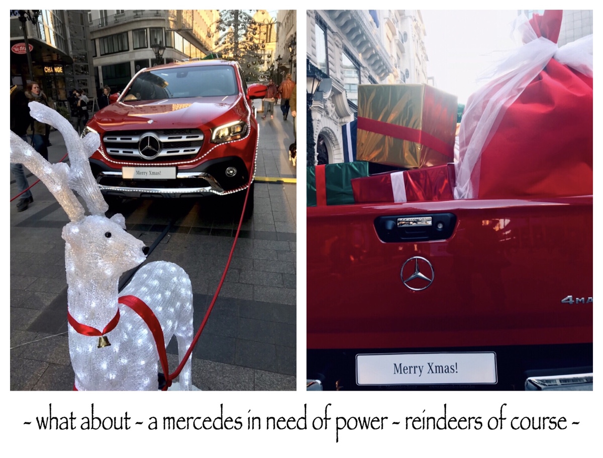#mercedes in need of power November 16, 2018 by B i r g i t t a, posted in Budapest, HAIKU, just for fun, photography, Poetry, street – what about – a mercedes in need of power – reindeers of course – Like Loading...