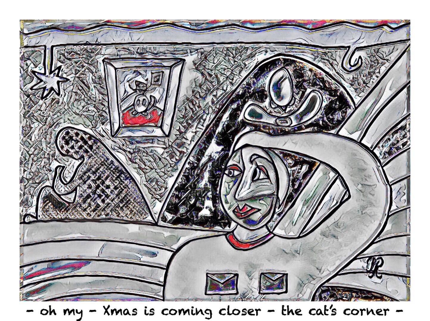 Cat’s Corner December 7, 2018 by B i r g i t t a, posted in cat, drawings, HAIKU, Poetry – oh my – Xmas is coming closer – the cat’s corner – Like Loading...