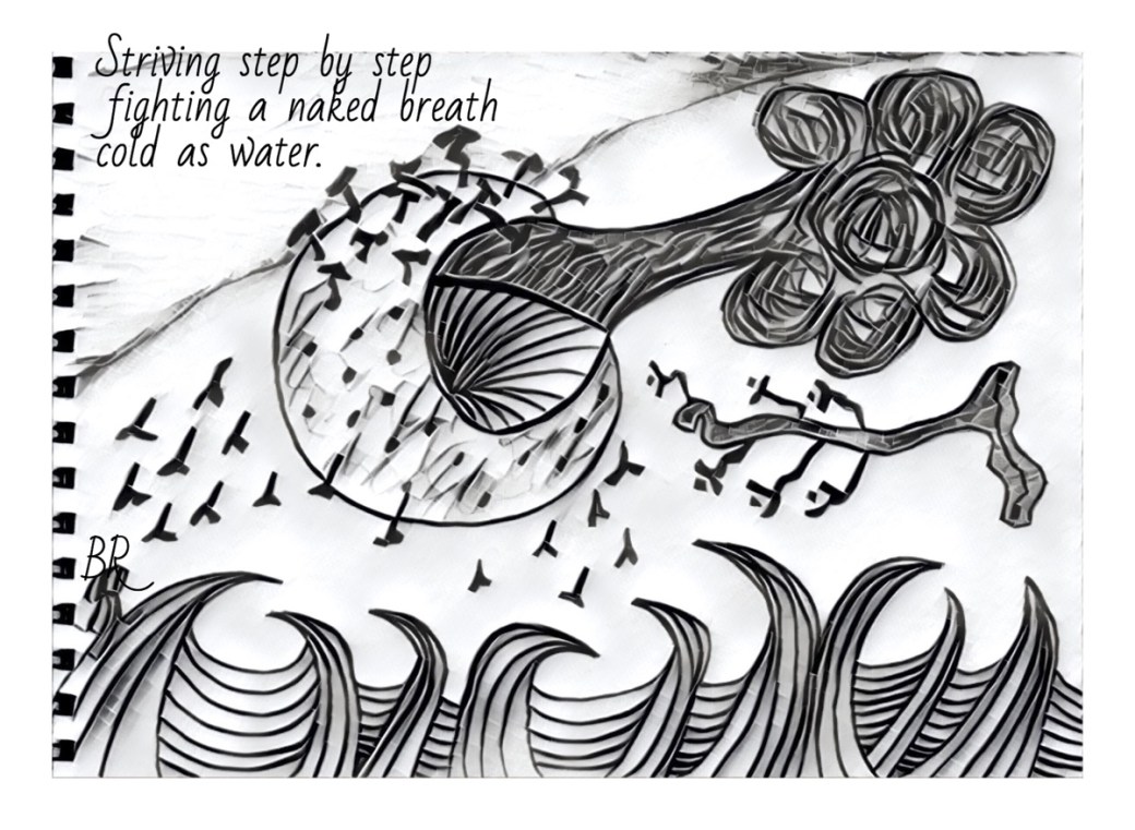 Fighting March 27, 2020May 10, 2020 by B i r g i t t a, posted in drawings, HAIKU, Poetry Striving step by step fighting a naked breath cold as water.