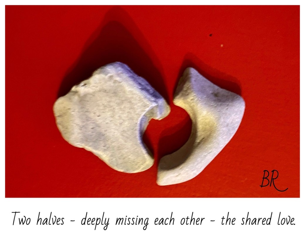 The shared love April 15, 2020 by B i r g i t t a, posted in Feelings, HAIKU, Love challenge, photography, Poetry, Stones Two halves – deeply missing each other – the shared love.