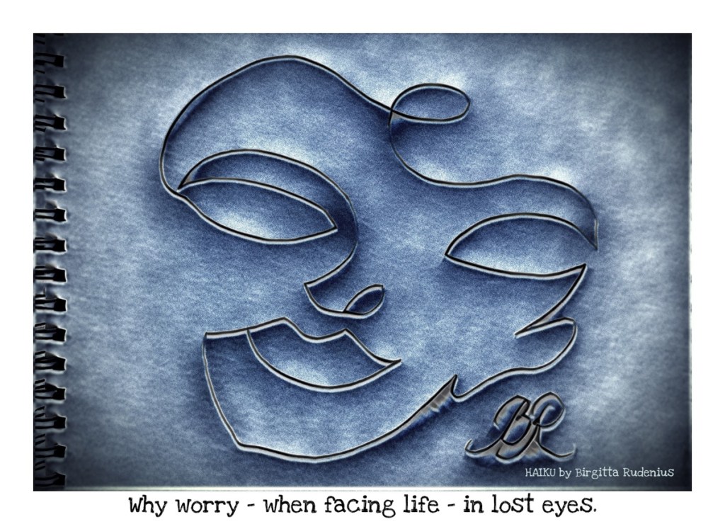In lost eyes July 17, 2021 by B i r g i t t a, posted in Crazy Art, drawings, Face, haiga, HAIKU, Poetry, sketch Why worry – when facing life – in lost eyes.