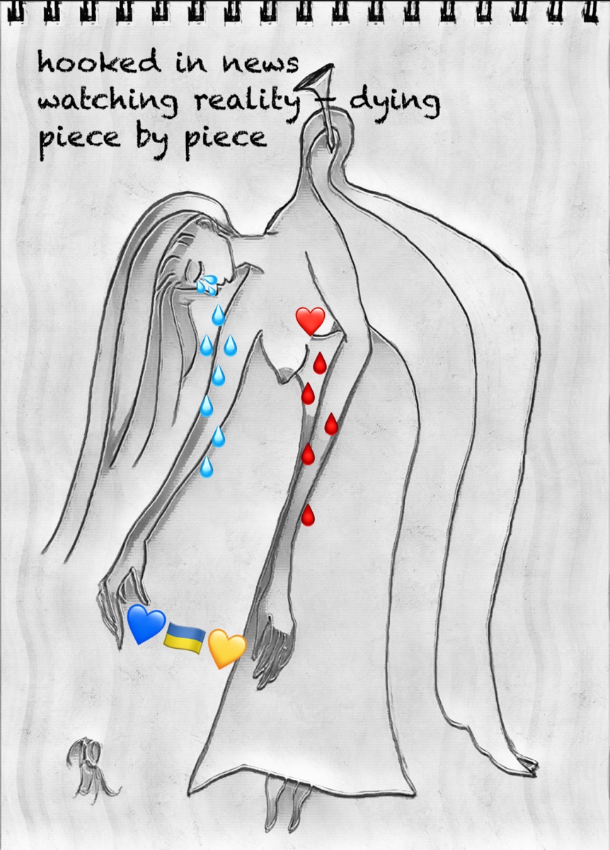 Dying — piece by piece April 4, 2022 by B i r g i t t a, posted in BRpoetry, death, drawings, Feelings, haiga, HAIKU, Poetry, senryu, sketch *hooked in newswatching reality — dyingpiece by piece#standwithukraine #haiku #senryu #haiga #haikupoetry #haikupoems #reality #war #russianwarcrimes #stopputin #stoprussia #freedomforall #BRpoetry #dyingpiecebypiece #slavaukraine Like Loading...