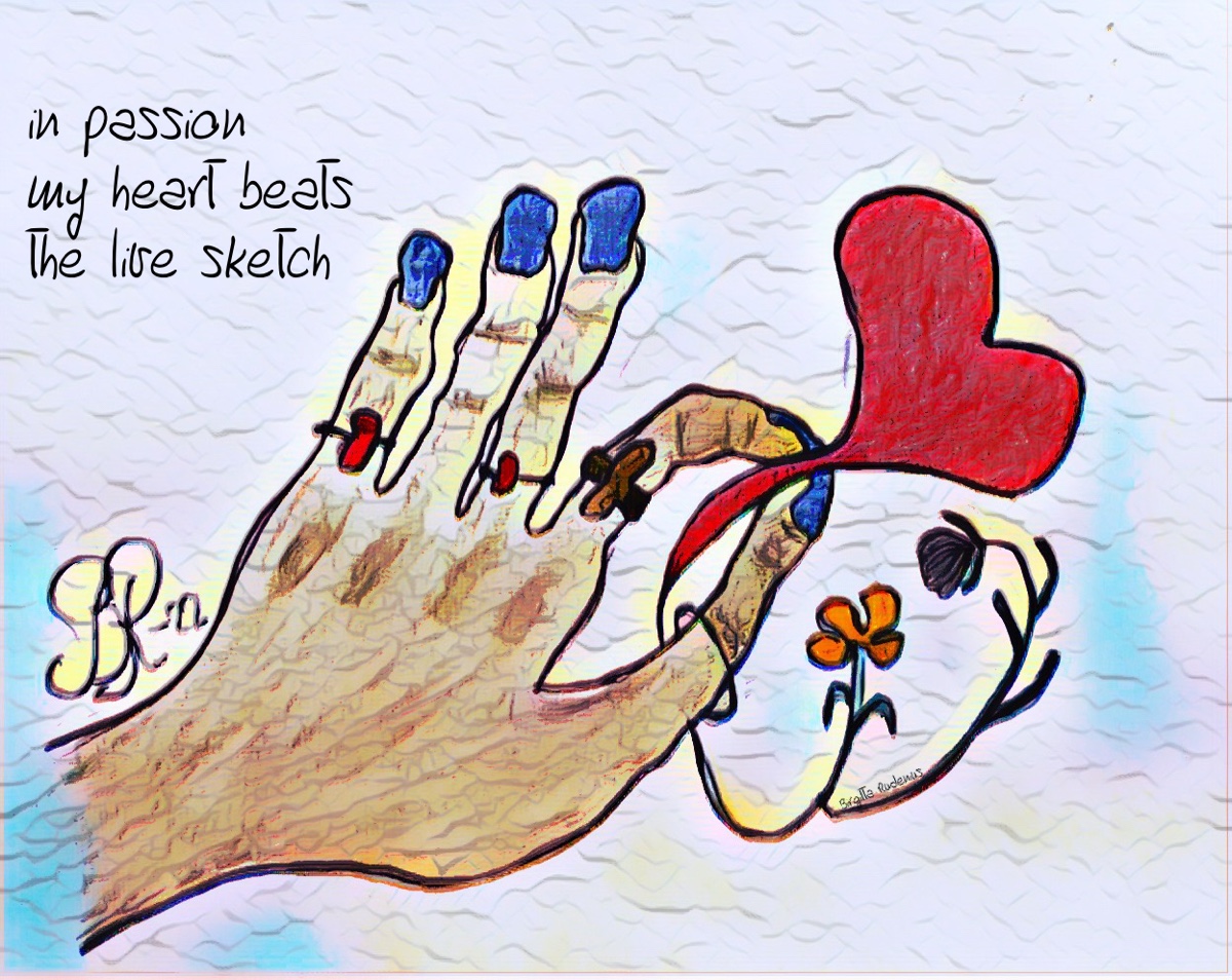 The live sketch June 9, 2022November 21, 2022 by B i r g i t t a, posted in 3lines, Crazy Art, drawings, haiga, HAIKU, hands, Poetry, senryu, sketch in passionmy heart beatsa live sketch Like Loading...