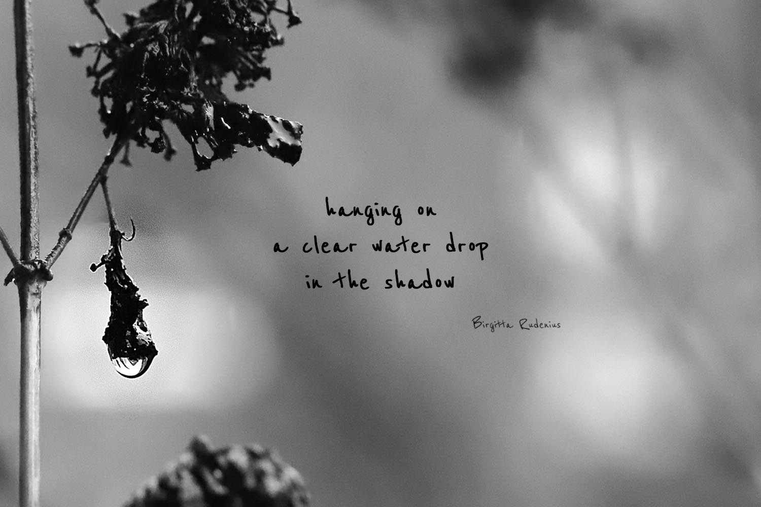 Hanging on January 11, 2023January 11, 2023 by B i r g i t t a, posted in 3lines, bw, Feelings, haiga, HAIKU, photography, Poetry *** hanging on a clear water drop in the shadow ***