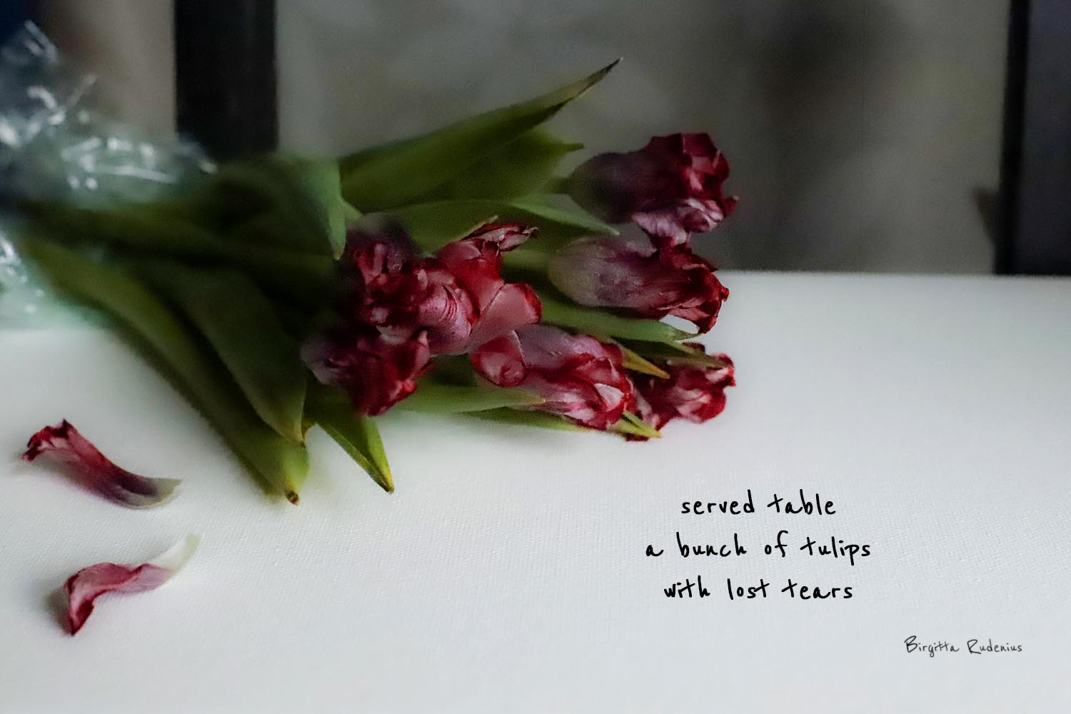 Lost tears January 26, 2023 by B i r g i t t a, posted in Feelings, flower, haiga, HAIKU, Poetry *** served table a bunch of tulips with lost tears ***